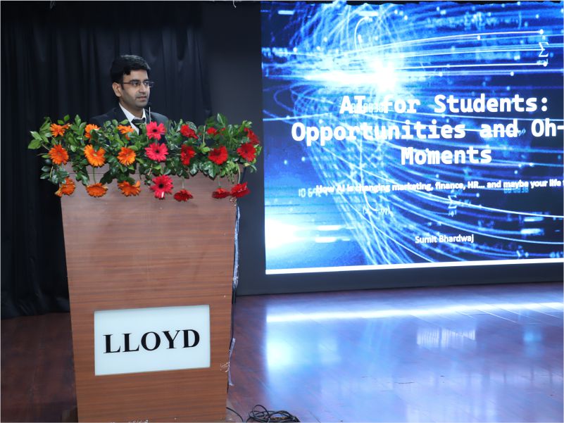 The second day, 26th August 2025, brought a more formal and engaging series of sessions in the auditorium. Distinguished guests included Prof. (Dr.) Vandana Arora Sethi, Group Director of Lloyd Group of Institutions; Dr. Sumit Bhardwaj, Manager – Analytics at Concentrix; and Mr. Saurabh Singh, Marketing Manager at Moon Beverages Ltd. Dr. Vandana Arora Sethi set the tone by sharing Lloyd’s mission and vision, inspiring students to strive for excellence. Dr. Bhardwaj provided valuable insights into the role of analytics and data-driven decision-making in modern industries, while Mr. Singh spoke about the dynamic nature of marketing and the evolving skillsets required. The vote of thanks was delivered by Dr. Shilpi Sarna, HOD UG Management Department. The day also featured a felicitation ceremony, honoring outstanding achievers from the 2023–26 and 2024–27 batches, including Hasan Abbas, Sameer Rai, Krish Raj, Aditya Trivedi, Shivam Dagur, Karan Pratap Singh, Mahi Bansal, Saurav Kumar, and Stanzin. This recognition not only celebrated excellence but also served as inspiration for the new students.